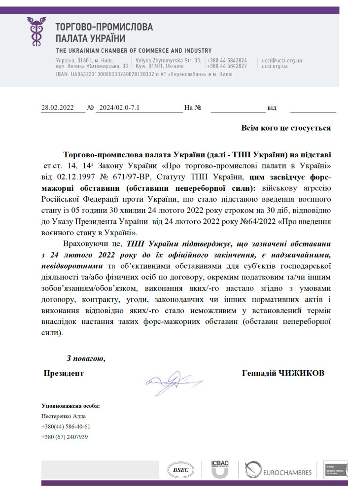 Доводимо до Вашого відома, що у зв’язку із введенням в Україні воєнного стану внаслідок військової агресії Російської Федерації проти України, з 24 лютого 2022 року, відповідно до засвідчення Торгово-промислової палати України (копія додається), почали діяти форс-мажорні обставини (обставини непереборної сили), які заважають нашій компанії належним чином виконувати власні зобов’язання, прийняті за укладеним із Вами господарським договором.